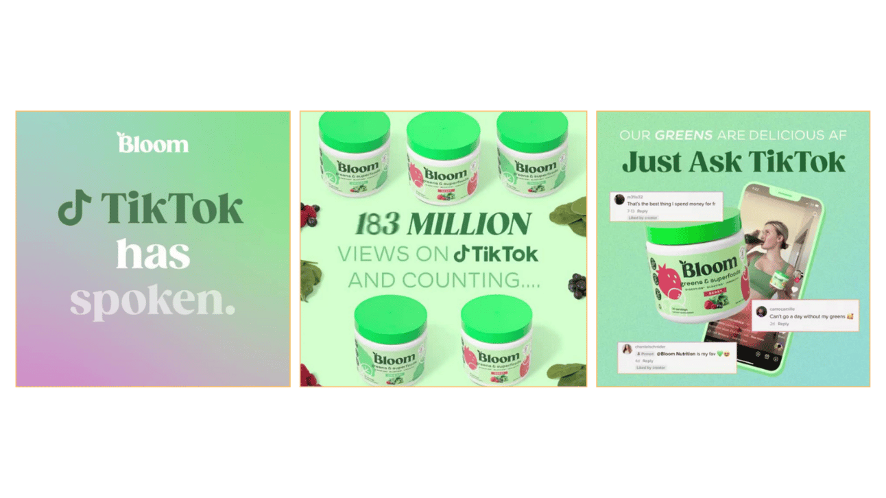 Run Video View ads on some of your organic social media posts to drive up views. Then use the number of views in your ad. For example, Bloom could say: “Meet The Greens Powder That Went Viral” or “See Why This Greens Powder Got 7,000,000 Views!”